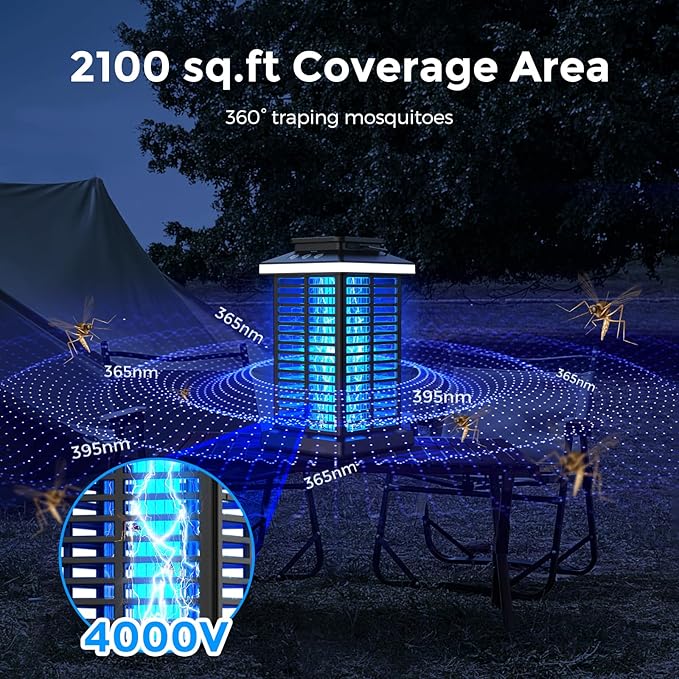 - 【Wide Area Coverage】This coverage area of the insects trap range up to 2100 sq. Ft. The outdoor bug zapper lamp is great for party, BBQ, dinner, cooking, relaxing, swimming in backyard. Our mosquito zapper killer lamp is no-toxic and odorless, safe for humans and pets. It will be a great gift for your families and friends.