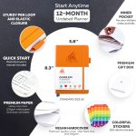 - UNDATED & UNIQUE LAYOUTS – An important feature of this planner is that it is undated; so, unlike most dated planners, you can start using it at any time of the year without wasting a page – it’s totally up to you to fill in the months and dates. That is why by design all 12 months come right up front and are then followed by the separate 52 weeks. Use 3 colorful ribbons to flip between weekly and monthly spreads.