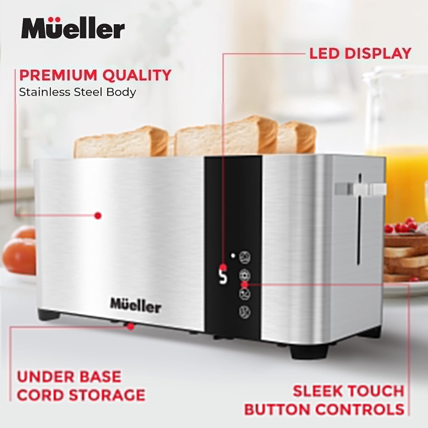 - Multifunctional Toaster – Kickstart your mornings with fresh toast or perfectly warmed bagels with the Mueller UltraCrisp 4 Slice Toaster. Features Cancel, Defrost, and Reheat functions, self-centering slot guides, and intelligent heating technology to deliver even toasting every time!